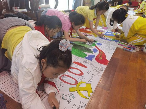 在“童心绘党恩”手绘T恤活动中,同学们发挥艺术创作才能,运用红色元素,在纯白的T恤上绘出一幅幅红色主题画。在“绘百米画卷”活动中,同学们一起动手绘制百米长卷,用手中的画笔,画上了天安门、国旗、国徽、人民英雄纪念碑、航天飞船、和平鸽等图案,表达对党和祖国的热爱与祝福。在“动手能力我最强”生活技能比赛活动中,比一比谁收拾书包又快又好、互相帮忙系红领巾考验合作能力等,同学们个个都拼劲十足。