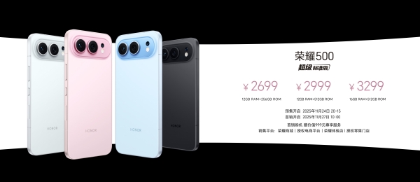 11月24日,荣耀500系列在杭州正式发布,该产品系列在影像、性能、续航、外观、体验等方面实现全维升级突破,重塑档位标准。荣耀500系列共两个版本,分别为荣耀500超级标准版与荣耀500超级Pro版,起售价分别为2699元、3599元,目前已经开启预售,11月27日10:00全渠道正式开售。