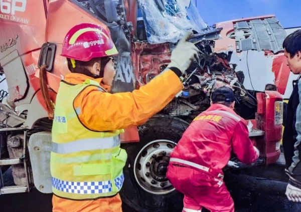 抵达现场后,队员们即刻展开勘察:四辆货车连环追尾,其中一辆40吨重型货车车头严重损毁,车身径直横亘隧道中央,将所有通行车道彻底堵死;另外三辆受损货车滞留现场,隧道内车流完全停滞,空气中弥漫着紧张气息——每一秒的延误,都可能加剧安全风险。