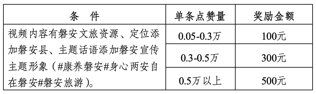 短视频宣传促消费活动:暑期期间,通过新媒体账号宣传磐安文旅资源(吃住行游购娱等),同时宣传磐安旅游主题形象的原创视频,经磐安县文广旅体局认定给予单条宣传内容100-500元奖励。相关视频内容相似度不超过70%,单个平台账号奖励不超过5000元。