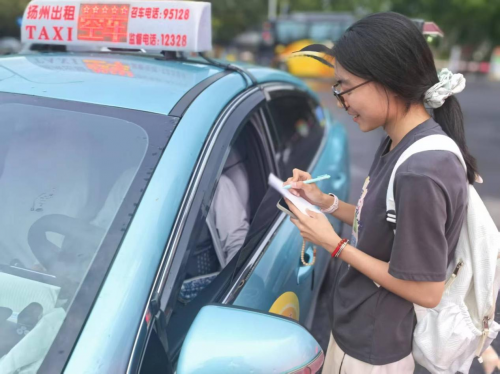 团队成员在扬州市邗江区交通枢纽记录网约车司机访谈内容。扬州大学杨子煊/摄