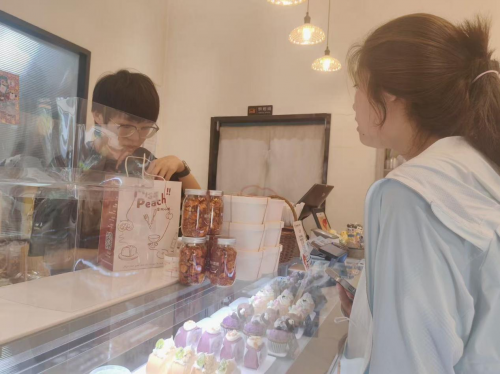 团队成员向张家港心绘之家烘焙店店长咨询暖心送面包店铺相关活动。扬州大学黄静怡/摄