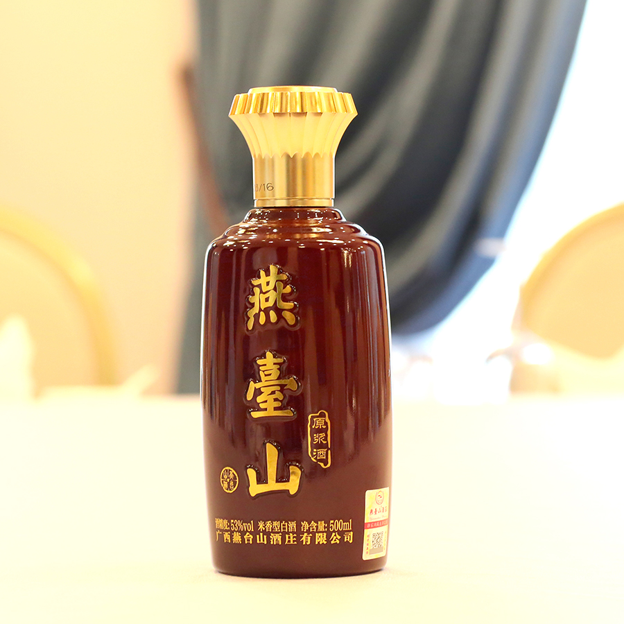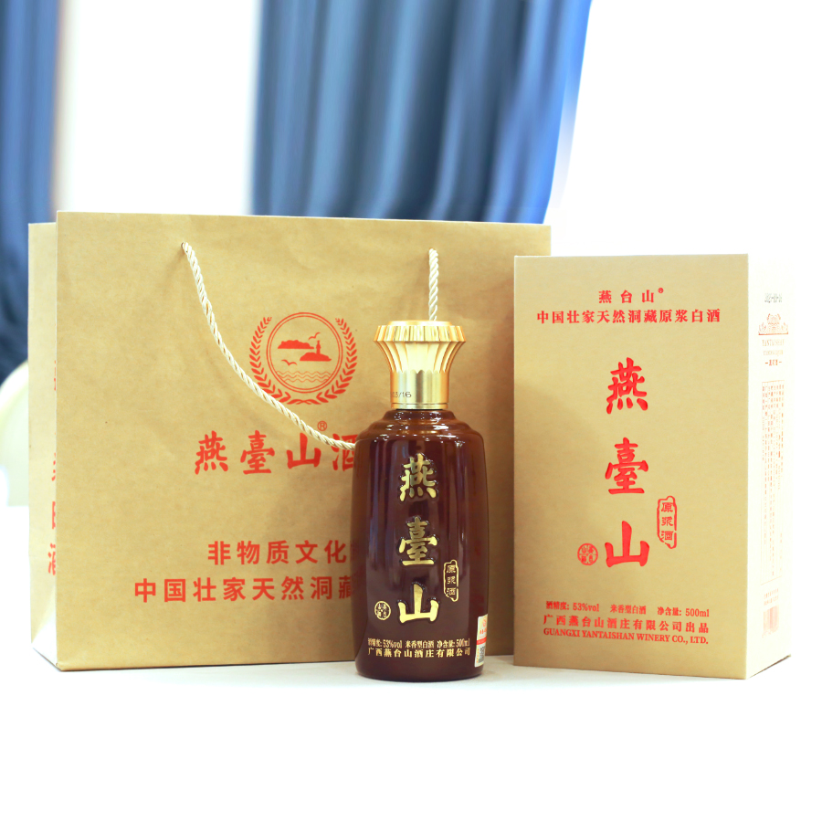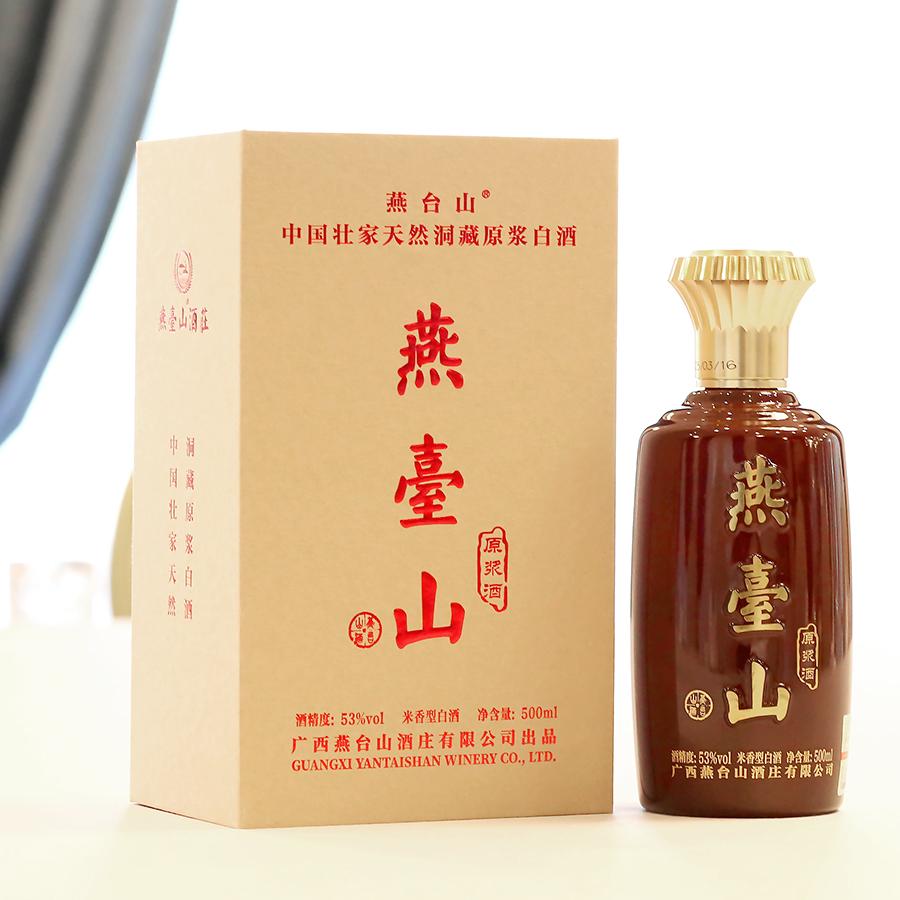 燕台山原浆酒,甄选三大核心原料匠心酿造:其一,世界十大地下暗河之一中国玄河之泉水,此水富含多种矿物质,酸碱度适中且为天然磁化小分子水,是酿酒的稀世好水;其二,选用富含铁、镁、钙等多种微量元素的优质有机大米;其三,搭配采用优质大米粉、野生草本植物、陈年优质曲丸等为原料,以祖传配方精心配制而成的酒曲。采用非物质文化遗产—“燕台山壮家白酒酿造技艺”精心酿制,然后储藏于恒温恒湿的燕台山酒庄天然溶洞中,经过长年的洞藏陈化,酒的辛辣味及其不良气味逐渐消失、减轻,使酒体变得柔顺、醇和,香味协调,出现老年陈酒的独特风味。