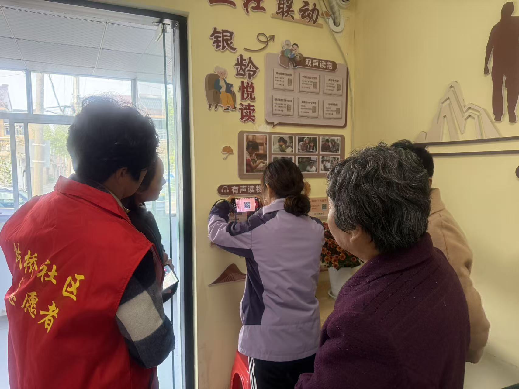 走进焕然一新的阅读空间,处处可见适老化设计的巧思。社区充分发挥“一地二用”理念,在原有老年助餐点基础上,精心设置了可调节斜度的阅读板、大字版书籍专区、适老化阅读助视镜等设施。特别值得一提的是,社区巧妙利用墙角空间,打造了“双声阅读”和“有声阅读”两大特色板块。其中,“双声阅读”精选了《三字经》《弟子规》等适合老少共读的经典读物;“有声阅读”则通过扫码听书的方式,让视力不佳的老人也能畅享阅读乐趣。