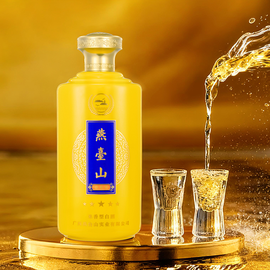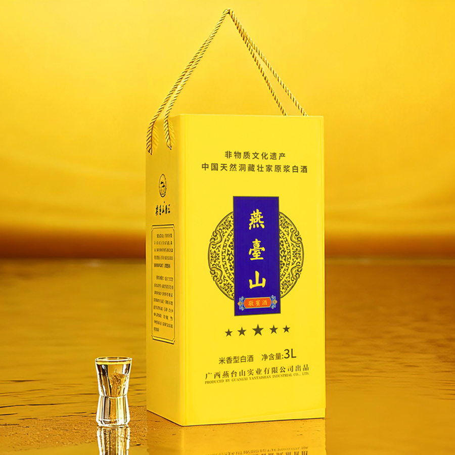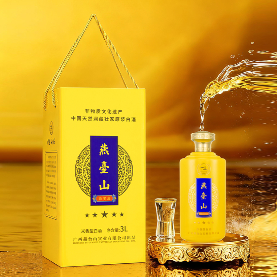 此次上市的燕台山敬宾酒,在产品呈现上极具辨识度。从产品图片可见,其采用明黄色主色调包装,瓶身与礼盒设计融合传统纹饰与现代审美,金色元素点缀其间,既凸显“敬宾”的尊贵感,又传递出壮家文化的厚重底蕴。礼盒上“非物质文化遗产、中国壮家天然洞藏原浆白酒”的标识,直接点明产品核心优势,3L的大容量装也为收藏、宴请等场景提供了更多选择。