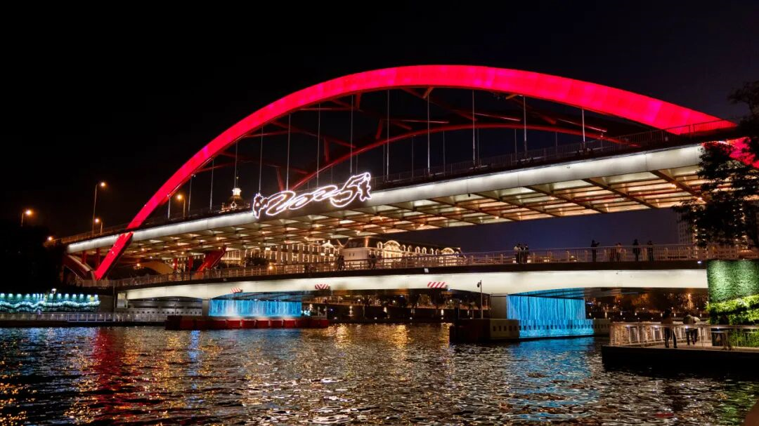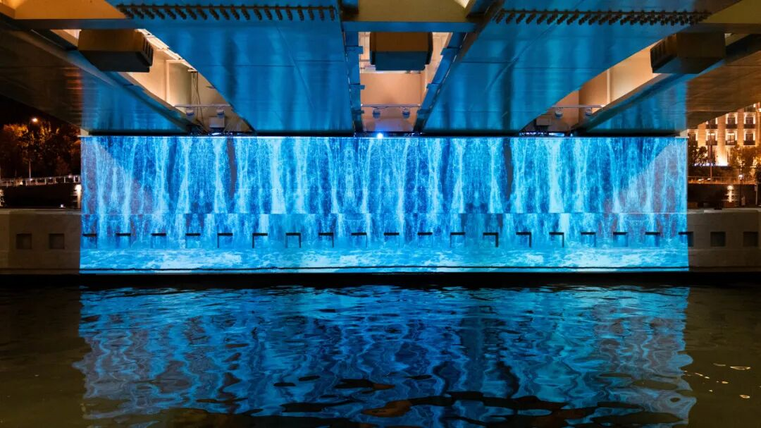 作为连接天津老城与红桥的交通要道,金钢桥以其独特的钢结构造型成为海河上的视觉焦点。此次项目采用 12 台 7000 流明*1*2CB-L795SE系列 投影机,凭借机身小巧的优势实现桥底灵活吊装。在宽 20 米、高 3 米的桥柱上,瀑布水流素材自然铺展,配合 3LCD核心技术的真实色彩还原,让水流光影清透灵动。当游船缓缓穿行桥下,游客们放慢脚步、举起手机。抬头是桥柱上流淌的 “瀑流”,身旁是海河的粼粼波光,打卡拍照的快门声与游船的轻晃相映,成为游客鲜活的旅行记忆。