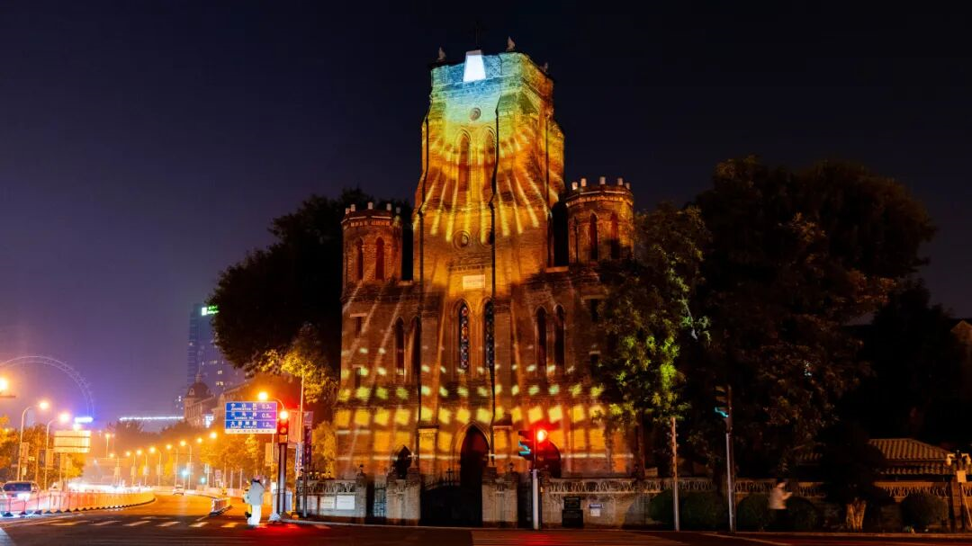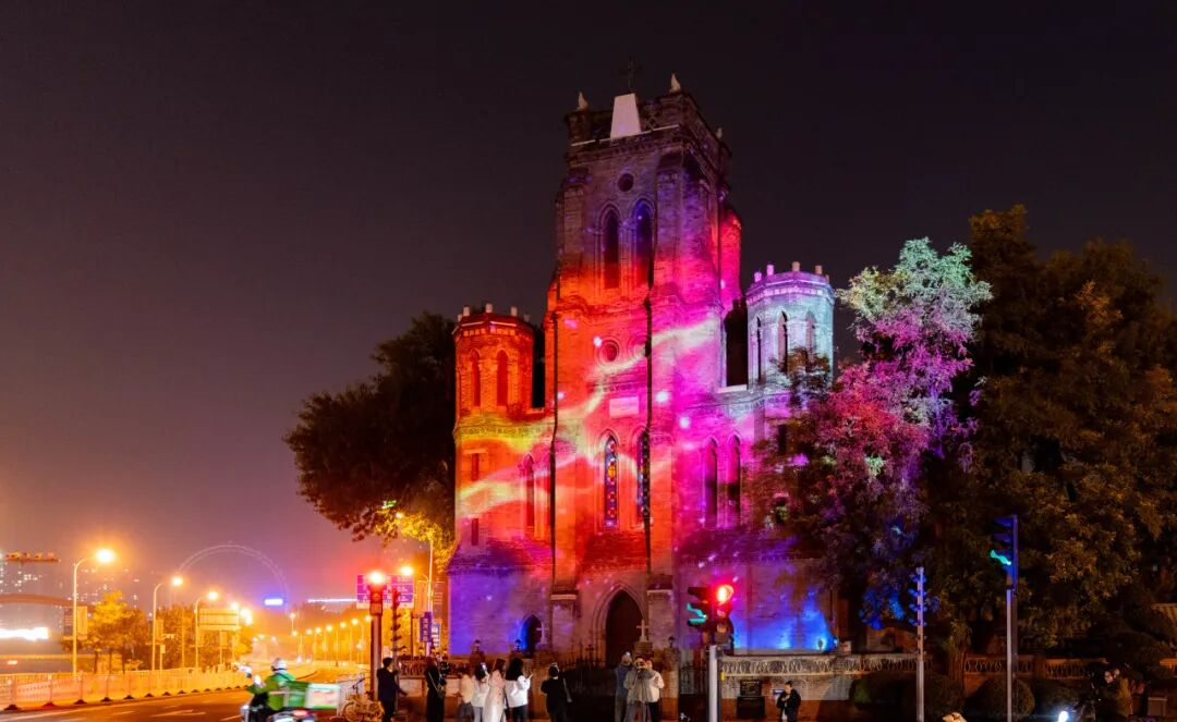 望海楼教堂宽 14 米、高 22 米的宏伟立面为光影创作提供了绝佳载体。3 台 30000 流明*1*2的CB-C35KU系列投影机强势助力,三重防尘系统确保设备在户外环境中稳定运行,为天津文旅名片打造注入硬核科技支撑。超高亮度轻松穿透夜间光线,细腻的色彩过渡让建筑浮雕与光影画面无缝衔接,往来游客常会在此驻足,以光影装点的建筑为背景打卡留念,成为天津文旅中极具辨识度的亮眼一笔。