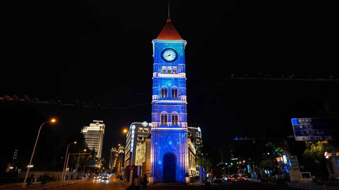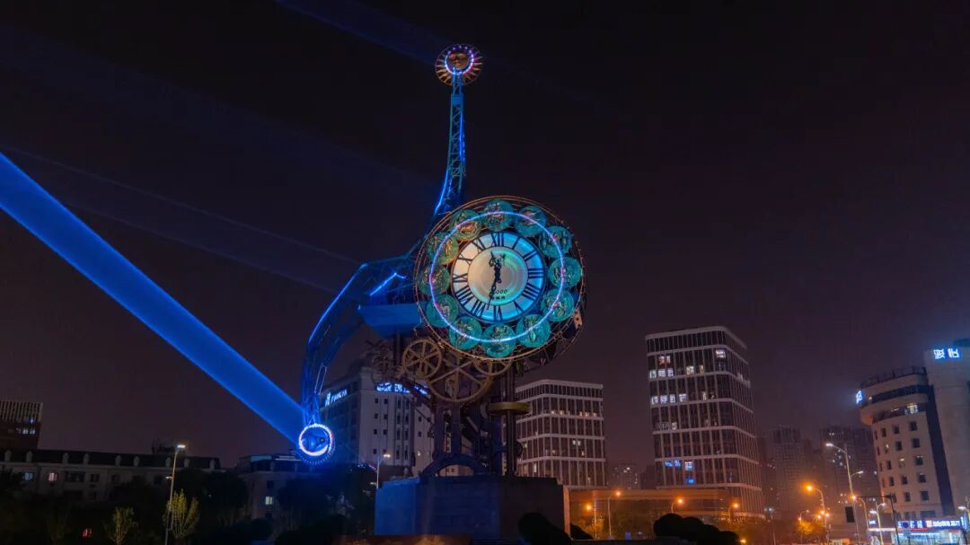 世纪钟既是时光的见证者,更是天津备受瞩目的标志性建筑之一,其独特的钟体造型与精致纹饰,为夜间光影呈现提供了天然的优质载体。2 台30000 流明*1*2的CB-C35KU系列投影机凭借 4K 增强*3分辨率,其高亮度不仅适配户外复杂光线环境,还精准还原钟面纹理与光影细节。当光影在钟体表面缓缓流转,与转动的指针交织成景,世纪钟不再只是冰冷的建筑,更成为鲜活的城市叙事载体。往来游客纷纷驻足,定格下 “时光与光影碰撞” 的独特瞬间。