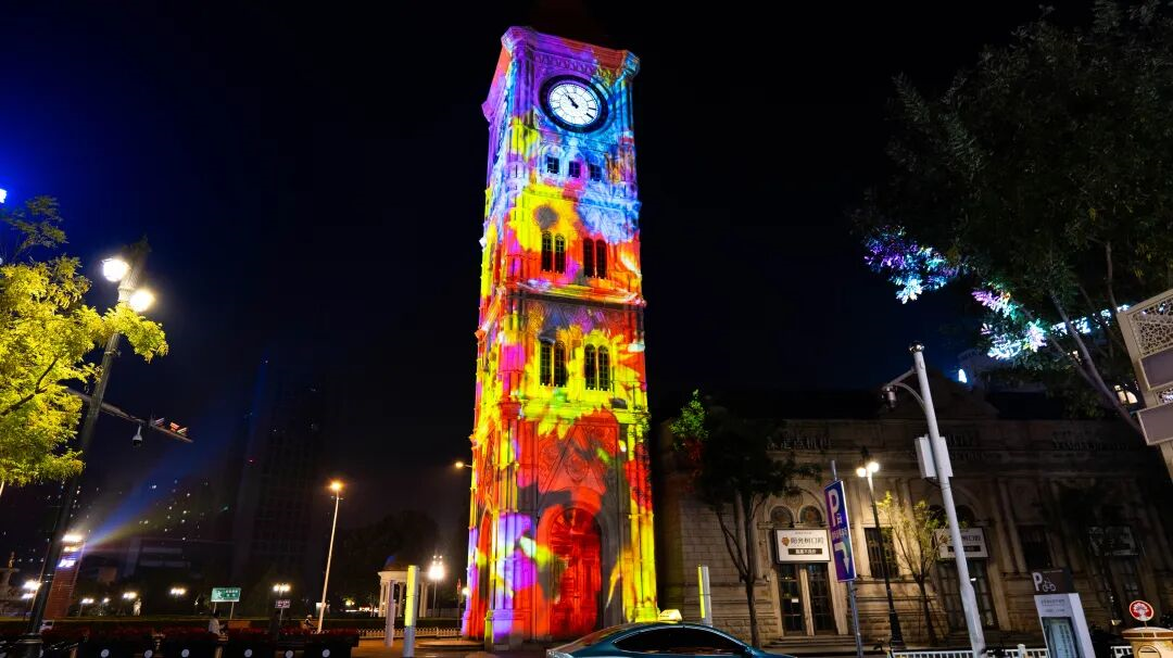 坐落于意式风情区高达 42 米、宽 6.2 米的钟楼巍然矗立,既是海河沿岸的制高点,更与周边建筑群相映成趣,为区域注入浓郁的异域风情。8 台30000 流明*1*2的CB-C35KU系列投影机协同工作,高色彩亮度确保画面从底部到顶端清晰均匀。借助多机融合技术,360°投影画面与钟楼墙体实现了高度精准的无缝贴合,钟楼墙面化作时光卷轴,从古代漕运繁华到现代都市崛起的画面娓娓道来。漫步风情区的游客,总会被这处光影地标吸引。以光影流转的钟楼为背景,搭配意式建筑,随手一拍便是兼具异域风情与城市记忆的大片。