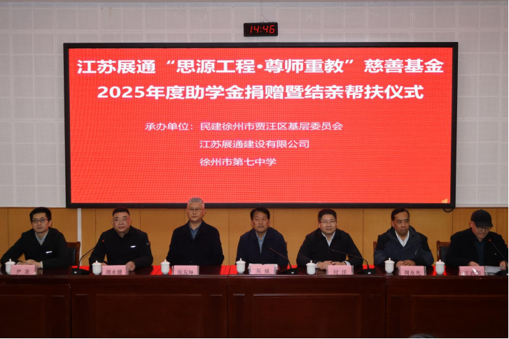 11月19日下午,江苏展通“思源工程·尊师重教”慈善基金2025年度捐赠暨结亲帮扶仪式在徐州市第七中学报告厅举行。本次活动由民建徐州市贾汪区基层委员会、会员企业江苏展通建设有限公司与徐州市第七中学联合举办。民建徐州市贾汪区基层委主委、贾汪区住房和城乡建设局局长付洋,贾汪区基层委副主委、江苏展通建设有限公司董事长张友坤,徐州市第七中学校长吴强参加活动,徐州市第七中学工会主席王武和主持活动。