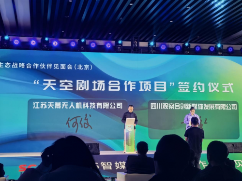 此外,江苏天幕无人机科技有限公司联合创始人何俊,代表天幕无人机与四川观察合创新媒体发展有限公司签约“天空剧场合作项目”,旨在融合无人机集群表演与全媒体传播,打造“天幕即屏幕,飞行即传播”的天空剧场新范式,助力四川文化出圈、旅游出彩、城市出新。