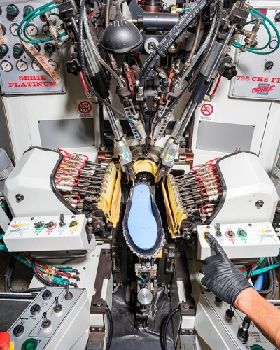 在耐克的产品创造体系中,精密工艺与亲力亲为备受推崇。在这座占地九万平方英尺的鲍尔曼鞋类实验室内,一位团队成员正为部件进行精密粘合前的细致涂胶。