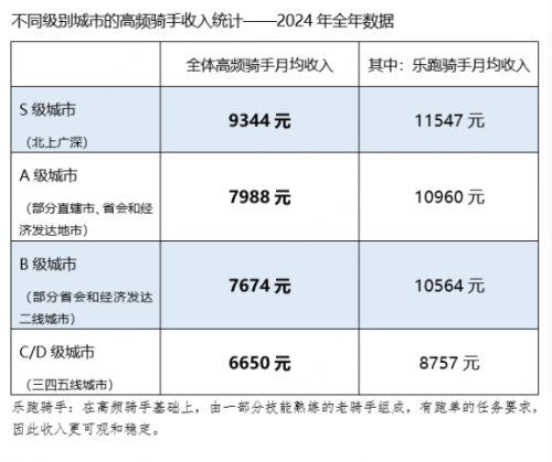 收入数据的持续增长印证职业吸引力提升。与2024年全年数据对比,2025年一季度高频骑手收入区间整体上移:高线城市乐跑骑手月收入从11547元增至12593元,涨幅达9%;全国骑手收入下限也较2024年的6650元提高580元。分析认为,收入提升与平台订单结构优化及补贴政策相关。