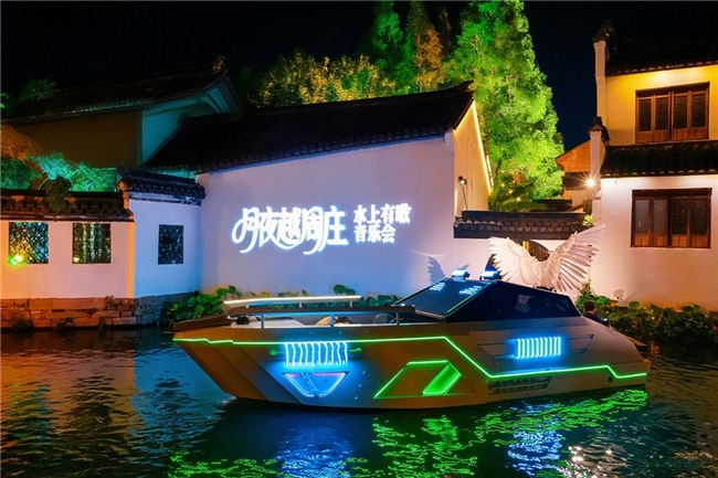 “突破”与“创新”才是关键词。积极拥抱新业态、新消费、新技术,与水乡文化结合,通过场景再造赋予周庄在新时代的生命力,才能将文化的“厚重感”转化为“新鲜感”。区别于传统古镇一味堆砌业态的跟风做法,月夜越周庄· 水上有歌音乐会是量体裁衣式的创新,以周庄的千年水道为基础,将“赛博朋克”的未来感融入江南水乡的场景中。游船既是移动舞台也是串联起水道的那一颗“珍珠”,不仅吸睛,还能通过全域音响矩阵在古镇的各个角落“先声夺人”,为古镇留住人更留住心。