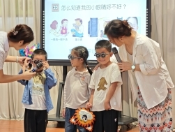 活动中,医生阿姨首先用生动的动画和趣味的眼球模型,向孩子们科普“眼睛的重要性”,让孩子们知道眼睛是我们珍贵的“小窗户”;接着,在“眼镜初体验”环节中掀起高潮,孩子们戴上特制的模拟眼镜,亲身体验视力模糊带来的不便;随后,孩子们又通过“蒙眼小游戏”,体验盲人走路的不便,感受失去光明的困难,懂得了珍惜与关爱;最后,在有趣的“爱眼小知识”互动问答环节中,孩子们争先恐后地举手发言,在欢声笑语中将护眼知识牢记心间。