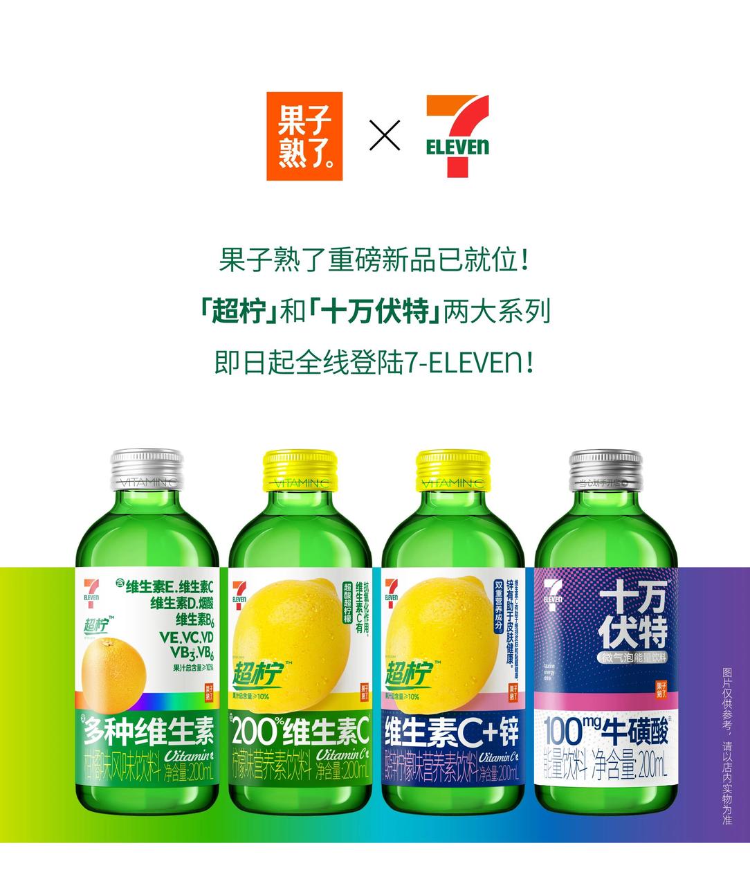除茶饮以外,果子熟了近期也在功能饮料领域展开新的布局。近日,果子熟了“超柠”与“十万伏特”两大营养素饮料系列已登陆7-ELEVEN便利店,以200ml绿色玻璃瓶包装切入“小瓶化”、“高颜值”的消费场景,适配日常通勤、即时能量补充等多种需求。