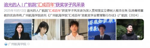 学生方面,航运学院张粲晟、封亚宁、黄子又,海工学院王奕建,低空学院许日妹、陈旭楷,智造学院陈基阳,未来交通学院关俊杰、张杰、曾子羽,管理学院范晟君、黄铭臻、池惠平,经贸学院蔡以琦、魏雪菲,人工智能学院陈晓鑫、吴周阳,数媒学院杨镇涛,外国语学院张茹郡,国际学院齐晨宇等20人脱颖而出。他们平均绩点位列专业前5%,主持国创、省创项目30余项,获“挑战杯”“互联网+”等省级以上奖励100余项,部分学生累计志愿服务数千小时,以“勤学、善思、厚德、求新”的校训精神诠释了新时代广航青年的风貌。