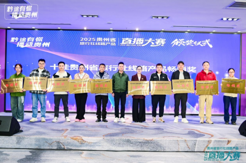 10月23日,历时三个月的“黔途有你 播动贵州”2025贵州省旅行社线路产品直播大赛迎来盛大颁奖典礼。来自各市州的获奖选手、获奖旅行社、旅游行业精英、高校嘉宾及媒体代表等150余人,共同见证了大赛“四个十佳”奖项及冬季主题旅游示范线路产品的发布。