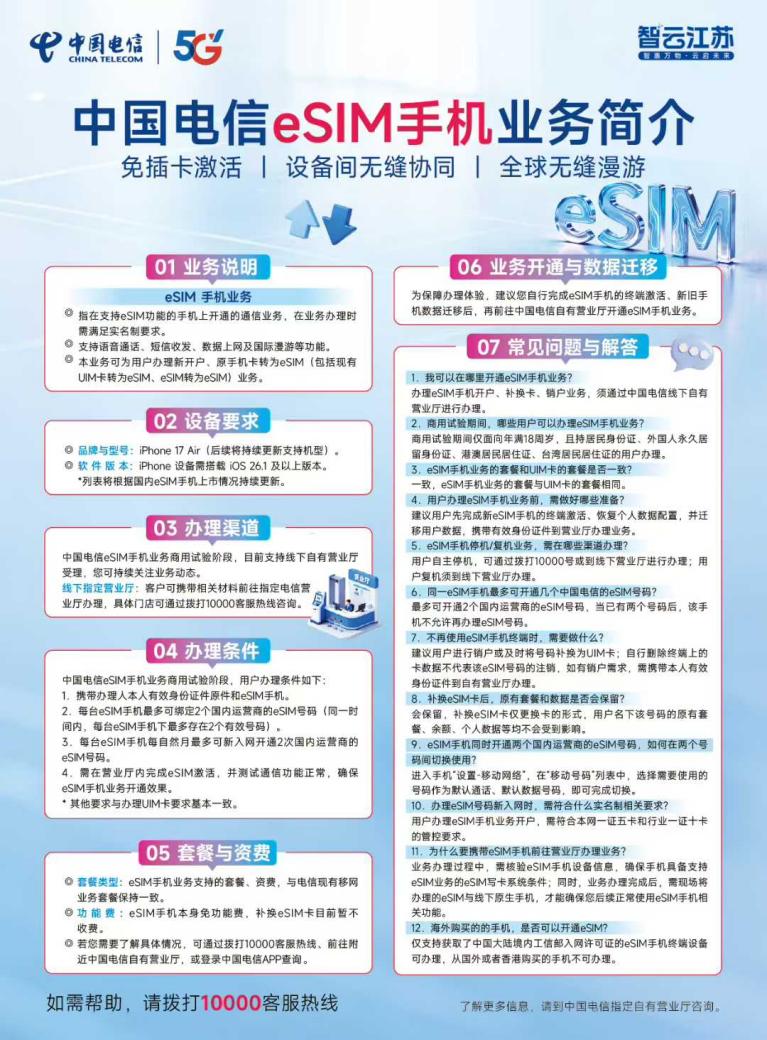 江苏电信以eSIM手机业务的“无卡科技”赋能千万苏城百姓的智慧生活,以建设“智云江苏”的数字力量,为千万用户的智慧生活注入通信新活力。告别传统卡槽,惠享轻薄时尚!江苏电信eSIM手机业务已全面就绪,即刻走进身边营业厅,拥抱“无卡”自由,畅享数字新生活!