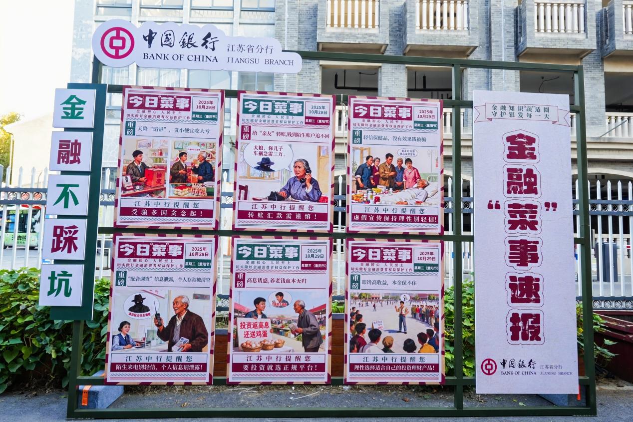 借鉴80年代社区宣传栏风格的今日“菜”事速报,将非法金融案例以“菜场新鲜事”的形式呈现。比如,大爷“轻信保健品,没有效果钱被骗”——江苏中行提醒您,虚假宣传保持理性别信;大娘接到骗子电话,说车祸急需三万 ——江苏中行提醒您,转账汇款需谨慎。