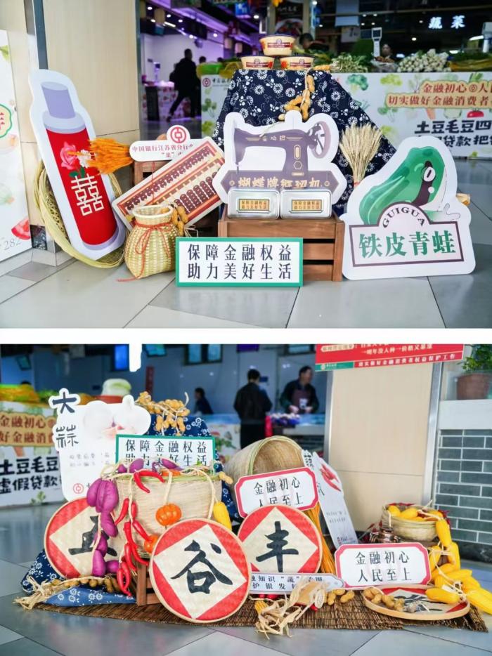 这一天,扬州方圈门菜场摇身一变回归80年代。菜场入口的门头设计别具心思,拱形门在一圈瓜果蔬菜的映衬下分外醒目,衬托出本次活动的主题——江苏中行金融消保宣教「菜市场计划」,红绿配色的“金融知识蔬适圈,守护银发每一天”对联也格外吸睛。菜场每个摊位下面都做了主题及金融消保趣味宣传栏,各种蔬菜瓜果组成了“反诈天团”,在清新的画面与鲜活蔬果和菜篮子的交织中,既醒目又充满年代感,瞬间将人们拉回那个质朴而真诚的年代。
