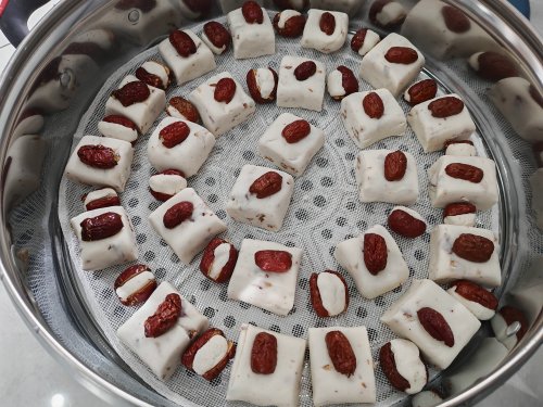 在社工的指导下,村民们分为两组协作:一组负责制作重阳糕,将糯米粉与粳米粉按比例混合,加入捣碎的红枣泥和温水揉成面团,用擀面杖压制成型,再撒上蜜枣碎和桂花;另一组则专注于红枣糯米糍,将蒸好的糯米团分成小块,装入去核的红枣。现场面粉飞扬,笑语不断。