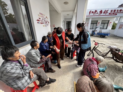 经过1个多小时的忙碌,蒸锅里飘出阵阵甜香。当第一批热气腾腾的重阳糕与糯米糍出锅时,村民们纷纷聚在蒸锅旁围观点评。“这糕蒸得松软,红枣味也足,比外面买的还好吃!”刚尝过一块重阳糕的李阿姨竖起大拇指。社工将打包好的糕点分发给在场老人,并特意预留出一部分,由志愿者送给在日间照料中心休息的老人。
