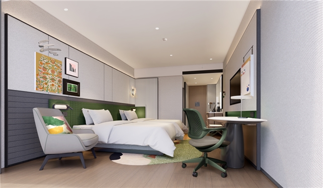 新版“欢悦版”围绕对“人”的细腻体察,将多巴胺配色大胆运用于酒店空间,通过色彩美学、灵动空间、科技智能,重塑中高端酒店空间体验,满足消费者对“悦己体验、灵活社交、情绪价值”的需求。全新大堂融入更多年轻化、活力感元素,岛台式智慧前台和Hi Corner模块等创新设计,让宾客体验更加愉悦。餐厅新增亲子用餐区,于细微处关怀宾客用餐体验,取餐区还可灵活调整桌椅布局,实现餐厅的百变多场景功能转换。会议室配备智慧化设备,打造流畅高效的商务会议体验。健身区和智慧洗衣房为旅客提供便捷服务和高效体验,响应商旅精英的多元化生活需求。