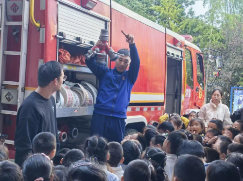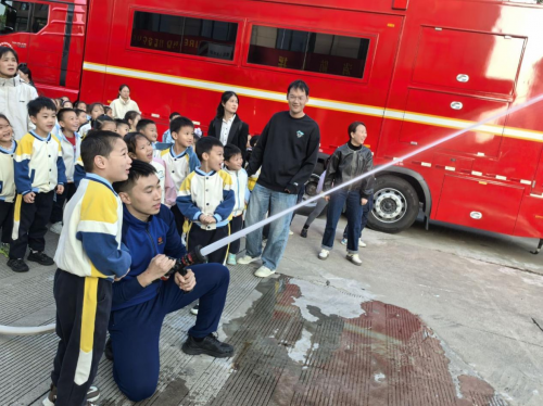 参观过程中,消防员还将消防救援器材一一摆放在孩子们面前,手把手讲解空气呼吸器、消防水带、破拆斧等装备的功能特点。当看到高压水枪、灭火器、急救箱等 “特殊工具” 时,孩子们的好奇心更是被彻底点燃,纷纷围在消防员叔叔身边追问。消防员不仅详细介绍了救援时的规范着装流程,还现场演示了消防水枪的操作技巧。在叔叔们的保护和指导下,孩子们轮流上阵,化身“小小消防员”,小心翼翼地握住水枪手柄,亲身体验消防工具的威力。