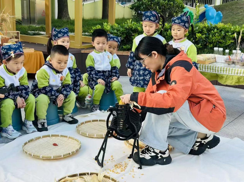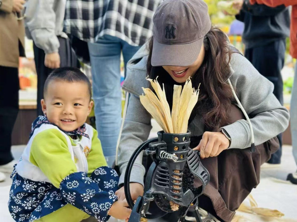 在随后开展的家长半日活动中,活动精彩纷呈。家长与孩子们通力合作,投入到热火朝天的劳动体验中。剥玉米环节,大小朋友们齐动手,在金黄的玉米堆中感受着收获的实在与快乐;制作丰收感官瓶时,孩子们将豆子、米粒等丰收果实精心装入瓶中,创造属于自己独一无二的秋日记忆;最富创意的还属“玉米创意发型秀”,孩子们以玉米须、玉米粒为材料,在家长的协助下设计出各种奇思妙想的造型,现场笑声与惊叹声不断。
