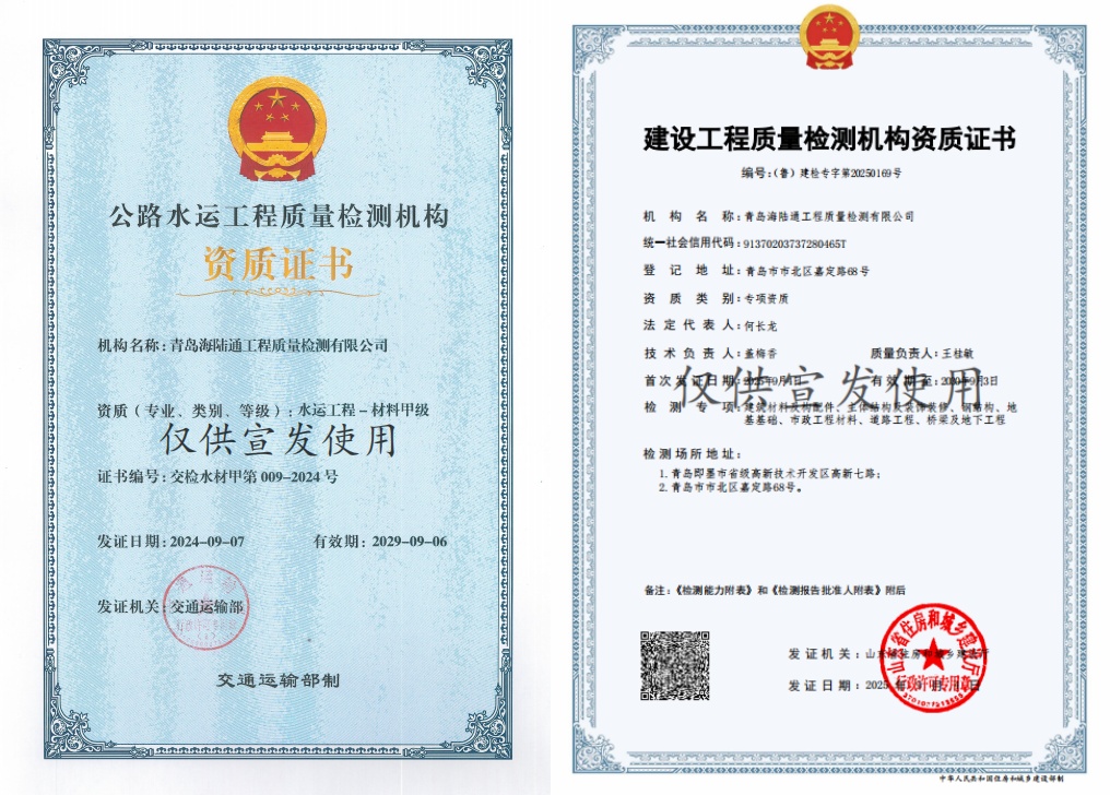 多元化的资质为多元化业务承揽提供“金钥匙”,海陆通检测公司拥有水运工程材料甲级、水运工程结构(地基)甲级资质,目前,全国范围内水运“双甲”单位仅20余家,海陆通检测公司放大水运检测优势点,为国家深海基地项目、广西平陆运河项目、印尼宾坦氧化铝配套7万吨级码头工程PC项目等大型工程项目提供试验检测服务。