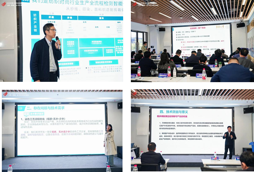 活动中,来自东华大学、江南大学、苏州大学的5位专家,进行了研究成果路演介绍。涵盖AI智能检验、生物脱胶技术、特种合纤面料、新型印花墨水等不同方向。企业代表与专家团队围绕技术瓶颈、研究成果展开深度交流,多项对接有望进入实质性合作阶段。这种“精准匹配+场景化对接”的模式,不仅让企业获得技术支持,更推动高校成果从实验室成推向产业化前沿,实现产学研的"双向奔赴"。