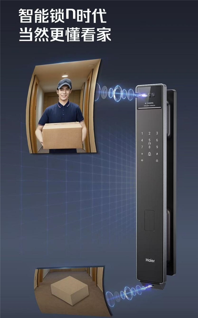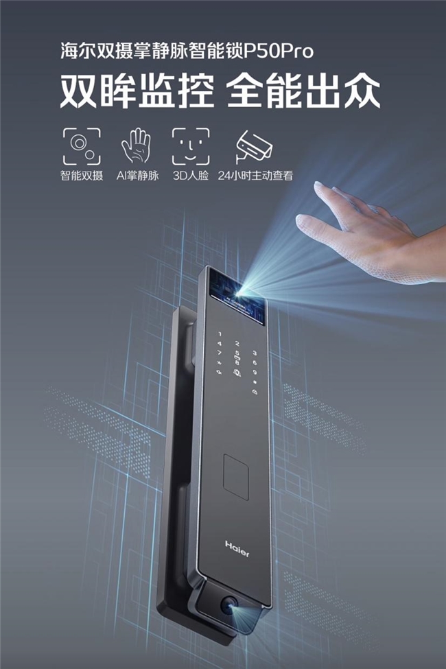 以爆品P50 Pro为例,它搭载海尔全新纵目TMAI多维视觉系统,并升级上、下双摄,识别上融合AI掌静脉和3D人脸双生物免触识别,给用户带来更安全、贴心的家庭安防体验。区别于普通门锁摄像头拍不到门口地面范围,这款产品的超广角下摄,综合可视范围提升130%,配合百万级真实像素,门口前侧、下方、侧边发生的一切一目了然,再不怕快递、外卖无故丢失。即使夜晚环境,高性能AI芯片也能进一步补充还原拍摄画面细节,图像清晰可见。