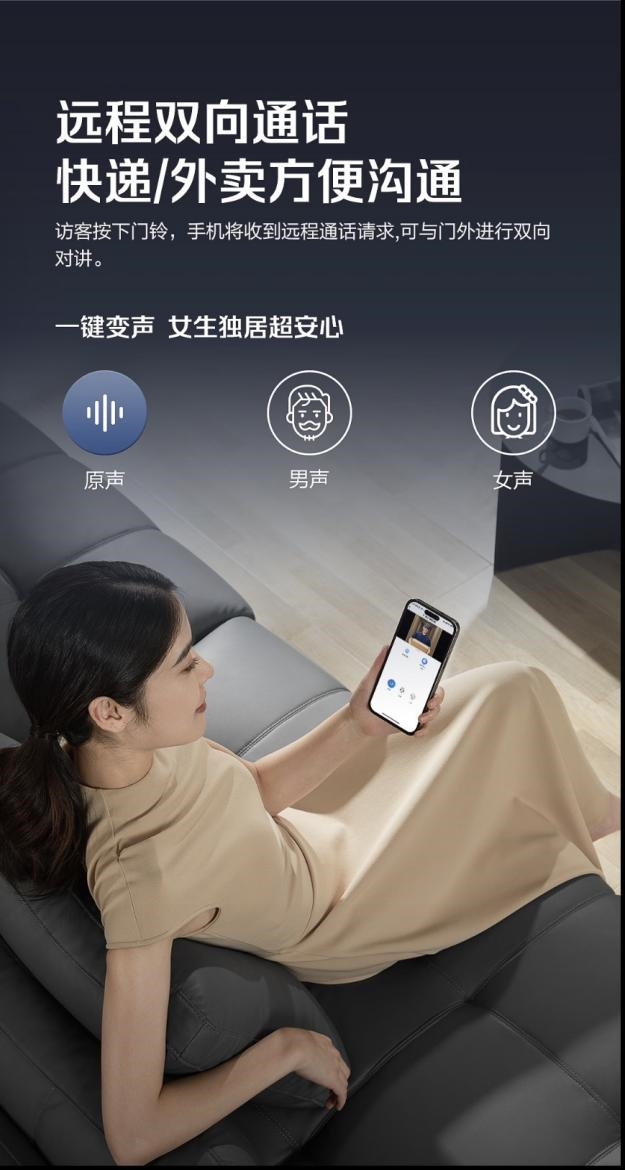 P50 Pro不仅安全便捷,更升级智慧生活体验。其支持手机远程与访客视频通话,并具备一键变声功能,呵护独居安全。当门外有异常逗留时,门锁将自动抓拍视频并推送至手机,主动防范风险。