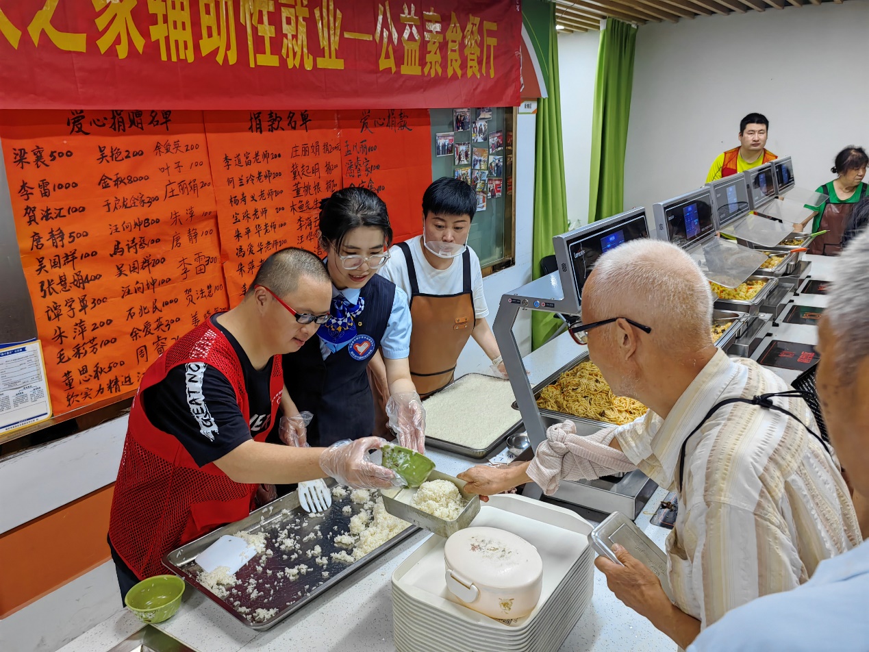 每天中午11点开始,中央门街道新模范马路9号的社区食堂都格外热闹,这里饭菜飘香,人流不断,不少老人甚至专门坐公交车每天来“打卡”。吸引老人们的不光是可口实惠的饭菜,更是餐厅里来自建行南京分行志愿者与一群大龄心智障碍者给予的温情陪伴。三年多的时间里,这家由建行南京分行支持建立的“公益素食餐厅”不仅累计为社区高龄老人、残疾人等18万人次提供公益午餐,更成为探索“大龄心智障碍”青年走出家门、融入社会的试验田。
