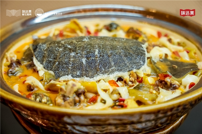 灵感源于对家乡河南烩面的执念,由于很难找到像北方一样筋道的面粉,李振浩以面粉、生粉与蛋清调制面糊,装入裱花袋,挤成细长条入沸水烫熟,创造出柔韧且富嚼感的独创“面筋”。汤底则融合自制酸豆角、仔姜、泡椒及味达美酸汤酱,酸、香、鲜俱全,与甲鱼的丰厚胶质相得益彰,呈现酸爽不腻、清鲜回味的独特风味。