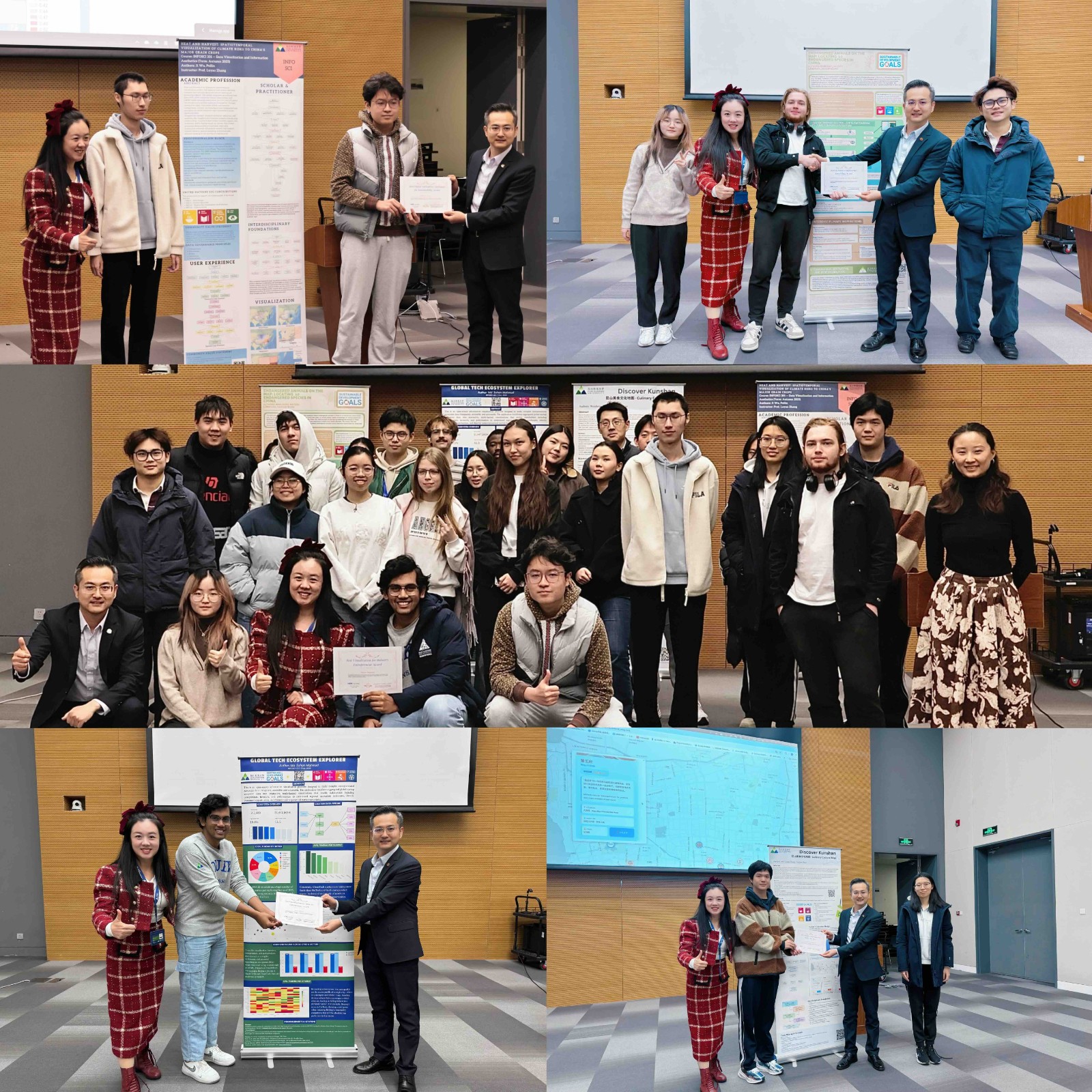 实地研学中的所见所感,为学生们带来了丰富的创作灵感。后续,在张露瑶教授《数据可视化与信息美学》课程举办的 “全球公民在行动:跨学科领袖共绘社区未来” 服务式学习反思研讨会上,同学们组队分享核心项目构想:一组聚焦濒危物种保护,提出交互式地图开发方案;另一组围绕研学体验优化,构思集章式沉浸式探索方案框架;还有一组瞄准儿童科普需求,初步呈现交互式 3D 动物模型应用雏形,为后续项目深化明确了方向。该课程期末项目已迈入协同优化阶段。2025 年 12 月 3 日,“联合国可持续发展目标下的生命、社区与可能性可视化研讨会暨社区合作式课程期末成果展” 在昆山杜克大学学术楼宴会厅举办,周庄生命奥秘博物馆高海斌馆长受邀出席。现场,《数据可视化与信息美学》课程学生组队展示了迭代后的 4 项完整成果:不仅呈现全功能交互式应用 demo,还同步公开开源数据与代码,并通过主题海报系统呈现研究思路与实践路径,彰显开源科学精神。高馆长对同学们的实践成果给予高度评价,肯定双方交流为博物馆数智化转型与科普资源创新赋能提供了宝贵启示;同学们也表示,馆长的专业反馈为项目优化指明了方向,助力作品进一步落地转化,更有效地实现从社群赋能到全球共享的社会价值,践行全球公民责任,为可持续发展注入青春力量。此外,梁凡教授的《新媒体与社会》课程的低年级新生以用户体验参与者的身份,通过结构化反馈,助力项目团队完善设计方案、优化无障碍功能,进一步提升科技向善、普惠大众的社区影响力。期待未来持续深化跨学科协作,推动数据可视化、媒体素养与社区导向型数字实践的深度融合,为科普传播注入数字技术新活力。此次研学及产教融合活动的顺利举办,离不开昆山杜克大学学生体验办公室的大力支持与协调。