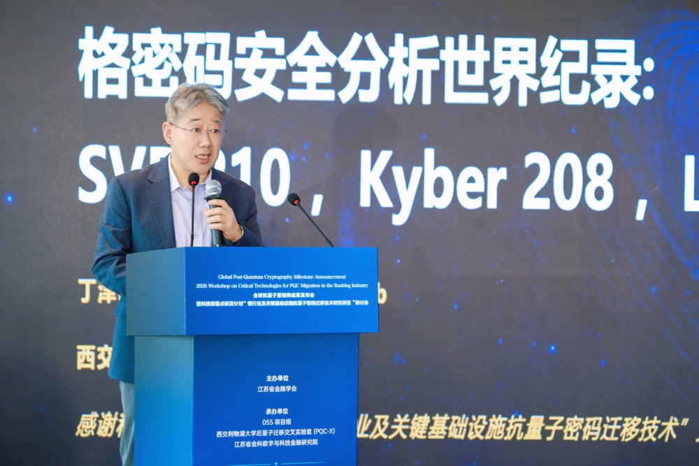 2026年1月10日,全球抗量子里程碑成果发布会暨国家重点研发计划“社会治理与智慧社会科技支撑”重点专项研讨会在南京举办。本次会议由江苏省金融学会主办,研发计划项目组、西交利物浦大学后量子迁移交叉实验室、江苏省金科数字与科技金融研究院承办。项目牵头人、江苏省金融学会会长周诚君和西交利物浦大学副校长丁忆民出席并致辞。中电科战略研究院责任专家吴震、中国科学院大学密码学院院长荆继武、中国科学院信息工程研究所研究员胡磊、国家密码管理局金融密码应用专家组组长教授李东风、南京航空航天大学教授黄欣沂、北京国嘉瑞联合会计师事务所(普通合伙)所长徐胜怀等特邀专家出席并点评,项目各子课题组分别汇报项目进展。